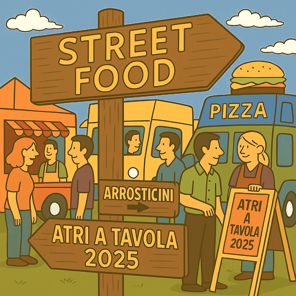 Preparati a lasciarti travolgere da un’esplosione di sapori, profumi e colori! Via Andrea De Litio, cuore pulsante di Atri a Tavola, si trasformerà ancora una volta in un paradiso del gusto: una vivace passerella di food truck coloratissimi, in arrivo da ogni angolo d’Italia. Il cibo sarà il grande protagonista: semplice ma sorprendente, tradizionale e creativo, capace di raccontare storie e territori in ogni morso. Dalle cucine regionali rivisitate ai piatti internazionali più curiosi, senza dimenticare le specialità locali reinterpretate in chiave moderna, ogni stand offrirà un’esperienza gastronomica all’aperto, informale e irresistibile. Accomodati sulle panche o passeggia sotto le stelle: ogni piatto sarà preparato al momento, da gustare lentamente sotto la magia dell’estate atriana. E per i nottambuli, lo street food non si fermerà: vi accoglierà fino a notte fonda. Ogni boccone merita il suo tempo! Segnatevi le date: 12 e 13 agosto, Street Food in Via Andrea De Litio. Vi aspettiamo affamati di gusto e allegria!