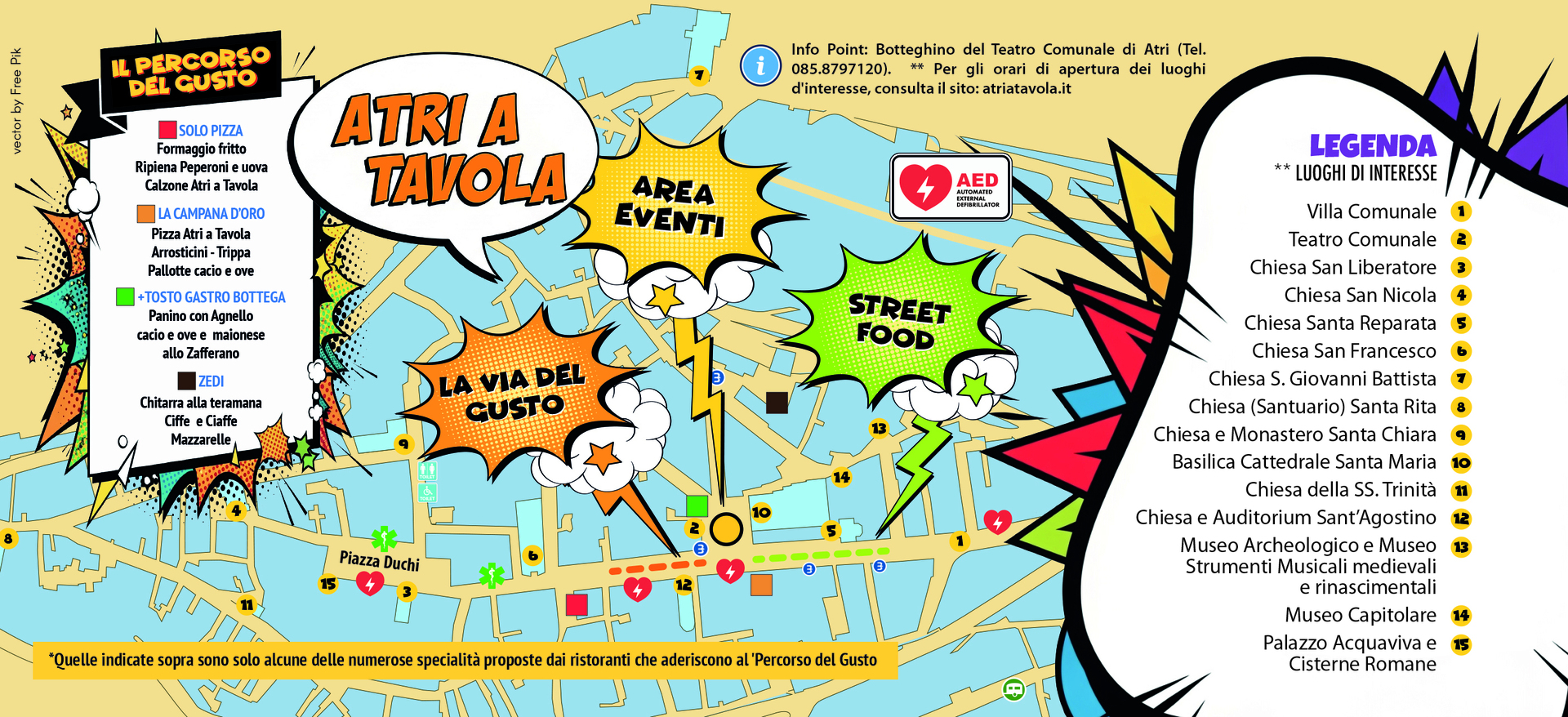 Benvenuti alla XXII edizione di Atri a Tavola! Un appuntamento irrinunciabile per chi ama i prodotti tipici abruzzesi. Lasciatevi sedurre dai sapori locali, mentre la brezza serale accompagna le vostre passeggiate tra le bellezze storiche della città. Passeggiando tra i vicoli dell’incantevole centro storico di Atri, tra palazzi nobiliari e scorci mozzafiato, vivrete un’esperienza che unisce gusto, cultura e tradizione. Chef e food blogger vi stupiranno ai fornelli, mentre la musica e gli spettacoli animeranno le piazze. Per due serate, la città ducale si trasforma in un vero e proprio palcoscenico del gusto, con Mercatini a km 0, Street food, Piatti della tradizione, Show cooking, Concerti, Visite guidate al Teatro Comunale e Ospiti d’eccezione. Non per vantarci, ma “Atri a Tavola” ha ricevuto più volte la medaglia di rappresentanza della Presidenza della Repubblica: un riconoscimento che e testimonia il valore culturale di questo evento. Atri a Tavola è un’esperienza da vivere, passo dopo passo, morso dopo morso.